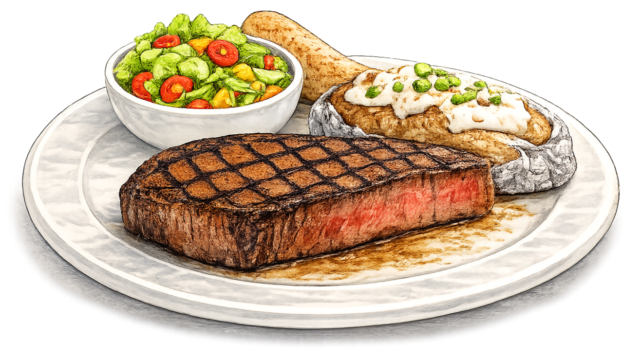 Open Flame Grilled Ribeye [GF] – Our finest cut grilled over an open flame. Served with mashed potatoes and squash vegetable medley. | Market Price